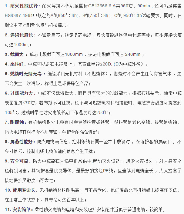 12. 安裝費用低:柔性防火電纜由于制作工藝先進,安裝簡單,在同等條件下其綜合費用比礦物絕緣電纜的費用明顯降低。